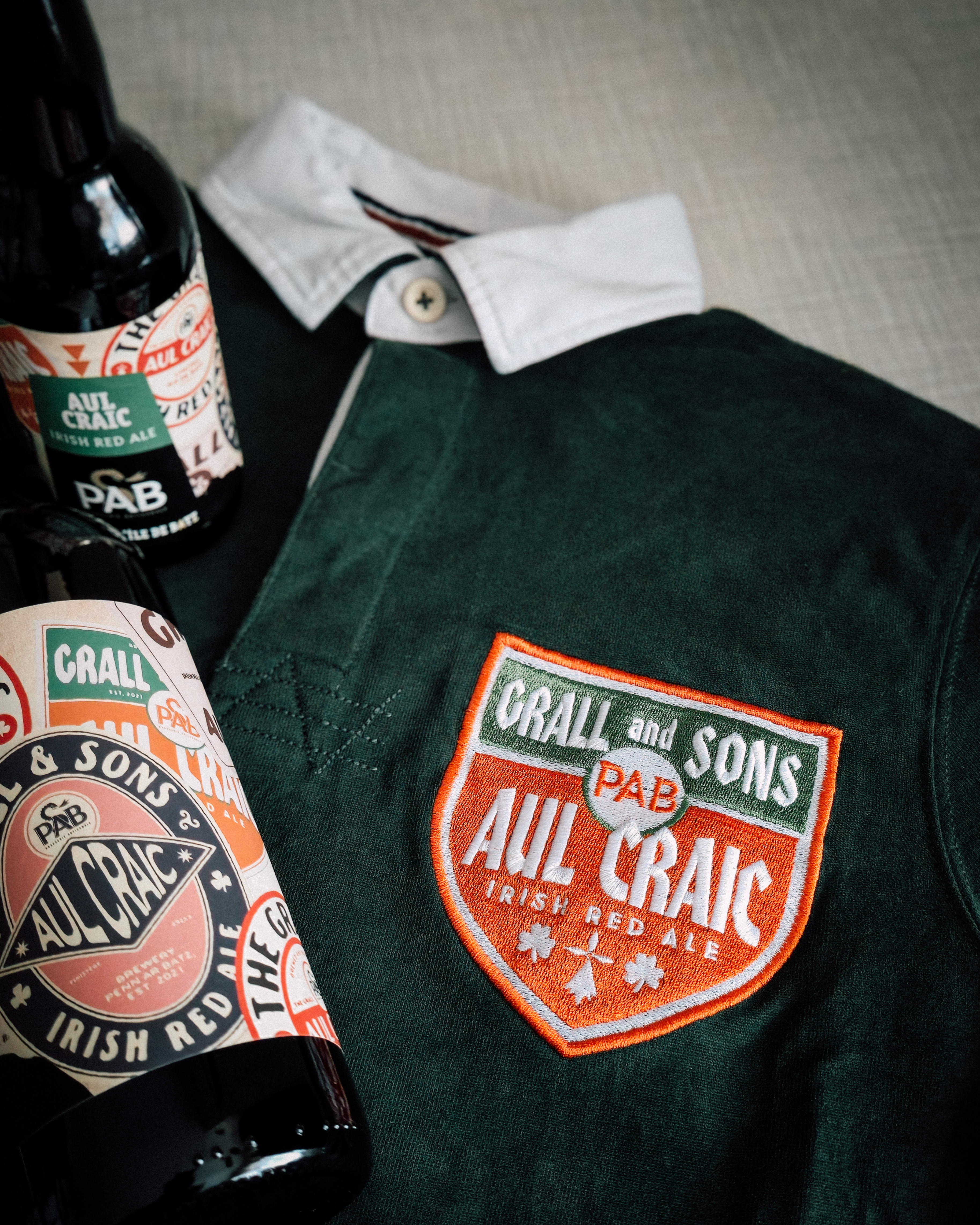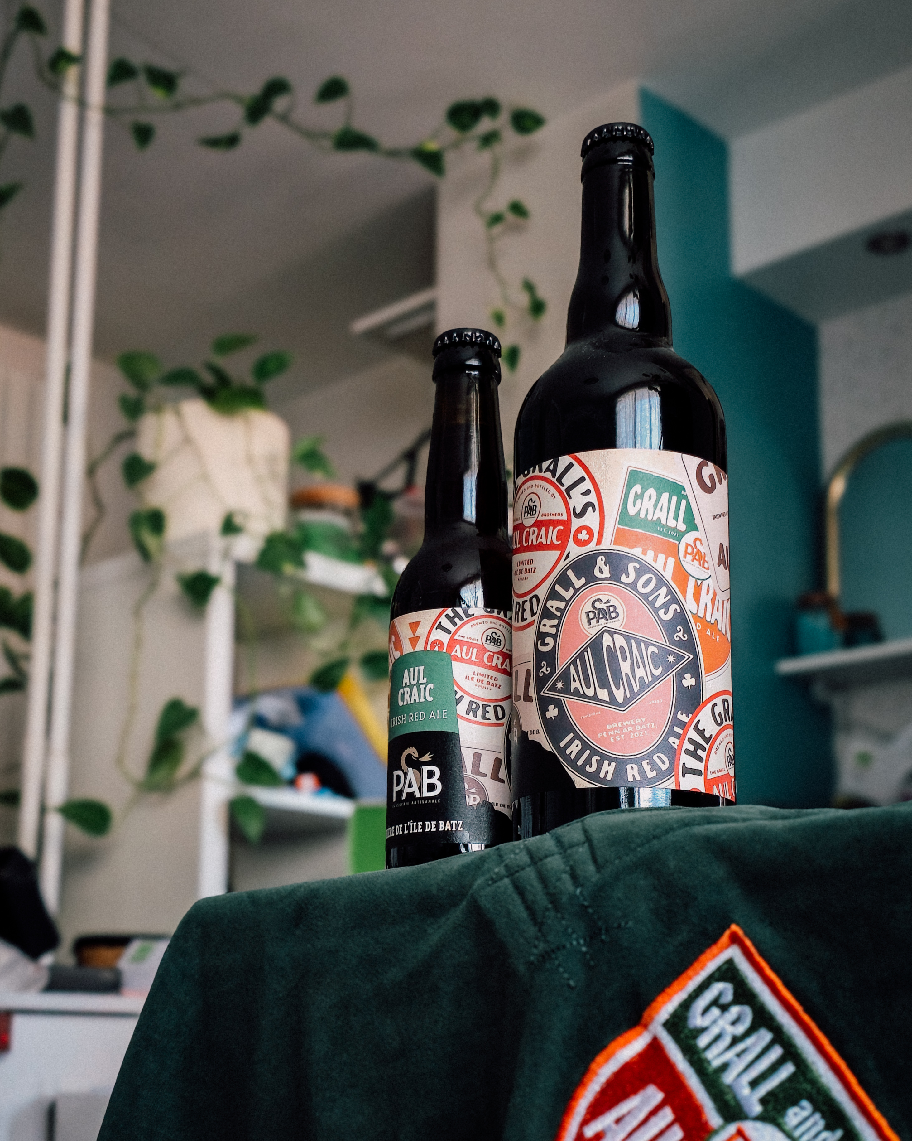 Inspirée des anciennes étiquettes de bières anglaises et irlandaises, l’étiquette d’Aul Craic reprend les codes visuels traditionnels à travers quatre variations graphiques composées en patchwork, comme une accumulation de stickers. Un clin d’œil à l’univers des pubs et à l’histoire brassicole, pensé pour une bière de caractère, ancrée dans la gamme permanente de la brasserie.